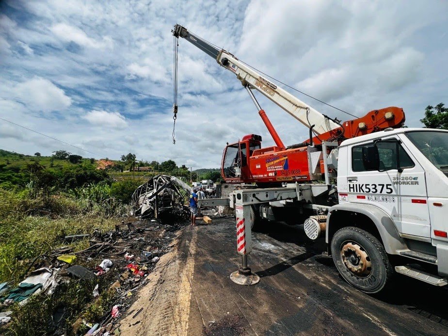 O Corpo de Bombeiros controlou o incêndio e resgatou os corpos até as 10h da manhã. As operações continuam para destombar o ônibus e acessar partes do veículo.